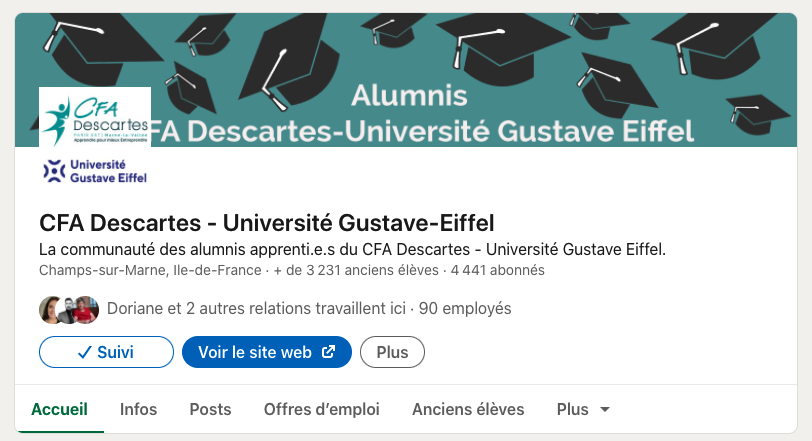Le CFA Descartes, a choisi de créer une page School sur LinkedIn pour créer un véritable ANNUAIRE DYNAMIQUE DE SES ANCIENS DIPLOMES : CFA Descartes – Université Gustave-Eiffel